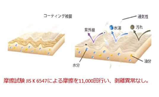 フィルム上に硬化する合成樹脂被膜は、強固で耐久性が高く、摩擦による劣化を大幅に低減します。 コーティングを行うことで、汚れの付着が大幅に抑制され、付着した汚れも容易に落とすことができます。