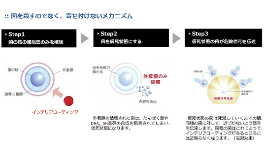 菌を殺すのではなく、寄せ付けないメカニズム 菌を死滅させるのではなく寄せ付けないメカニズムで、低濃度でも高い効果を発揮。使用量も少なく、コストを抑えながら素材への影響も最小限に。 さらに耐性菌が生まれにくいので、長期で安心してご利用いただけます。家具や革製品を清潔に保ち、長く美しく守ります。 抗菌・抗ウイルス機能の詳細はこちらから